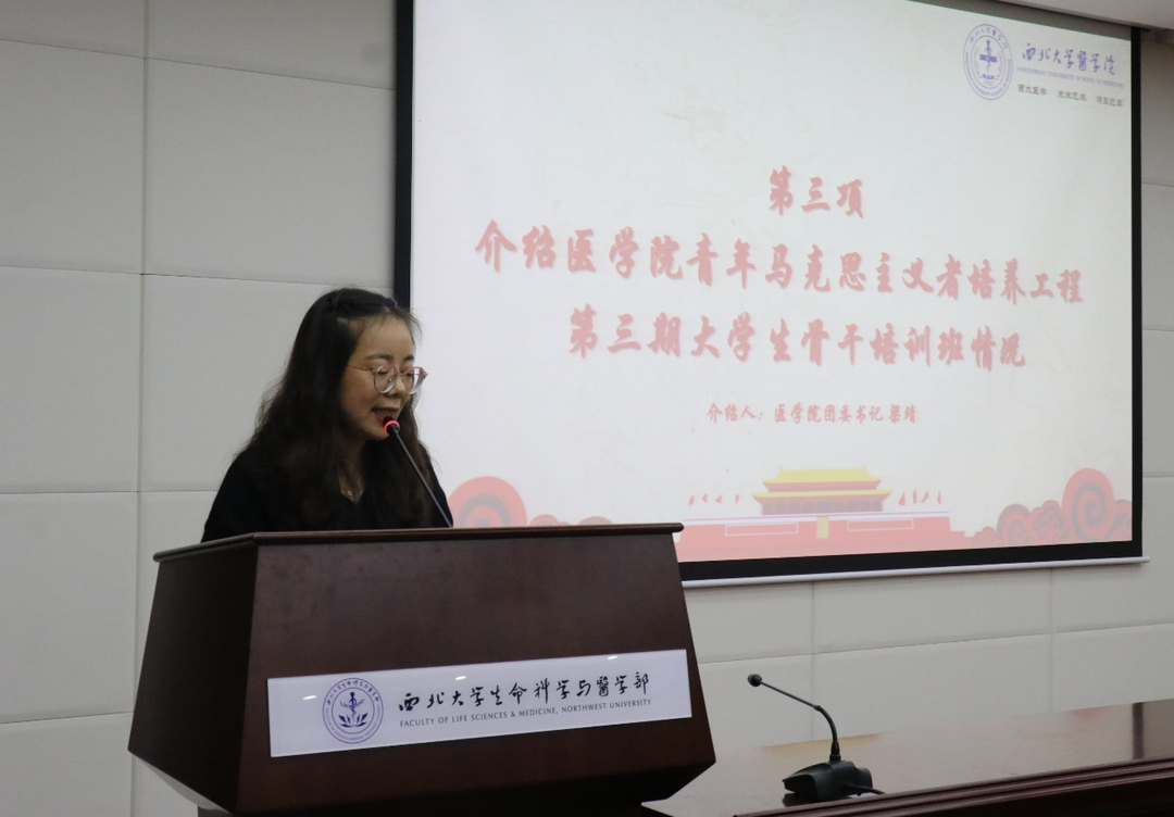 学院团委书记梁靖介绍了培训班情况和课程安排。本期青马班培养内容围绕理论学习、实践活动、红色教育、学者引领四位一体,推行“一二三四”育人模式,通过开展“医青之声”青年讲团课、参与附属医院志愿实践、专家讲座等系列活动,让青年骨干深刻领会、准确把握习近平新时代中国特色社会主义思想的精神实质和丰富内涵,全面领会党的二十大精神。2021级口腔医学专业张闻远代表本期青马班学员发言,承诺将严格遵守青马培训班的规章制度,积极参加学院组织的各项学习及实践活动,提高工作水平和思想觉悟,成为一名“有理想、有道德、有文化、有纪律”的青年马克思主义者。