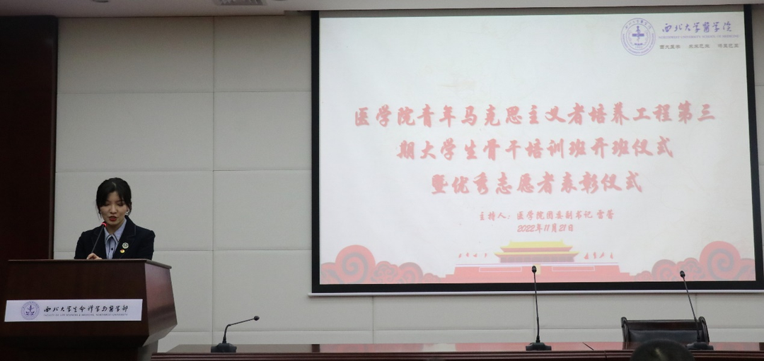 11月21日,beat365中文官方网站青年马克思主义者培养工程大学生骨干培训班第三期开班仪式暨优秀志愿者表彰仪式在博望报告厅隆重举行。校团委副书记齐钊,学院党支部(直属)副书记杨涛、团委书记梁靖、全体青马班学员及2022级医学生参加了开班仪式,仪式由学院团委副书记雷蕾主持。
