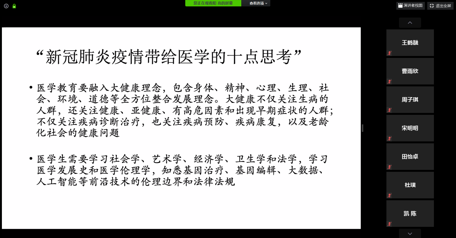 高阳老师为同学们解读了新时代公共卫生行业的定义,以及新冠肺炎疫情后医疗健康在国家战略中愈加重要的地位,讲解了新冠肺炎疫情带给医学的十点思考,介绍了从生物医学知识的学习逐步扩展到医生职场的心理社会化适应与发展的过程是医学生职业生涯发展的必由之路;同时以“风险传递与感知的鸿沟——概率”“口罩背后的文化心理差异”两个具体事例讲授了医患沟通中的倾听、理解、表达的重要技巧,帮助同学们深刻理解国家和民族在此次抗疫阻击战中展现出来的众志成城的精神以及中国特色社会主义制度的优越性,引导同学们厘清了未来从医学生成为一名“党和人民信赖的好医生”的成长道路。