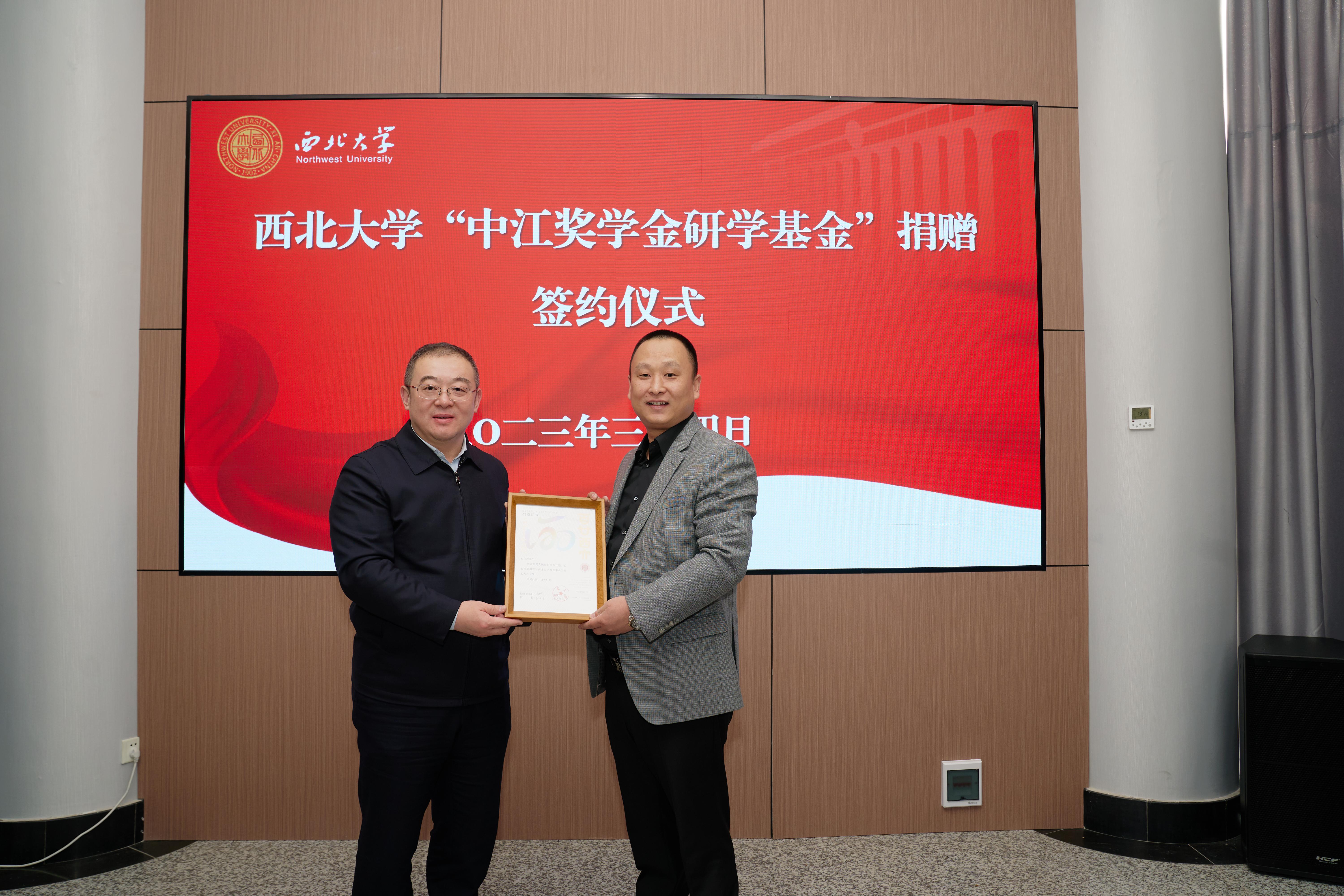 2023年3月4日上午,beat365中文官方网站“中江奖学金研学基金”签约捐赠仪式在太白校区举行。校党委常委、副校长常江,北京爱心企业家冉江涛、梁翠丹,校友郝重庆出席仪式,国内合作与校友工作处、学生工作部、研究生院、生命科学与医学部、碳中和学院负责人参加。