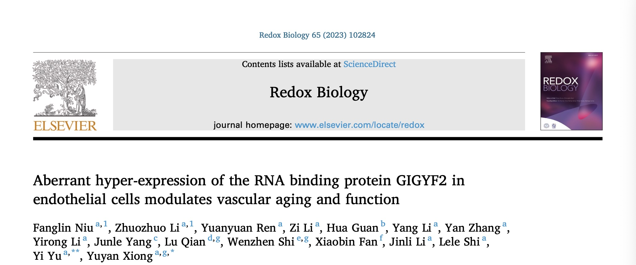 近日,beat365中文官方网站生命科学与医学部熊裕焱教授团队在GIGYF2在血管内皮细胞衰老中的生物功能及其调控机制的研究中取得了新进展,研究结果以研究长文(Article)形式发表在《Redox Biology》杂志上,题名为“Aberrant hyper-expression of the RNA binding protein GIGYF2 in endothelial cells modulates vascular aging and function”。