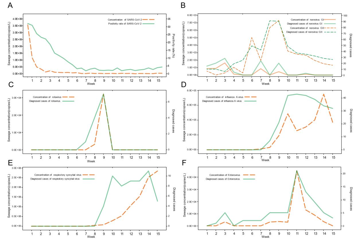 研究收集了同期RSV、IAV、诺如病毒、SARS-CoV-2和轮状病毒的临床确诊案例,通过比较废水监测数据与临床确诊数据,发现这些病毒的污水浓度动态与它们在社区中的传播趋势相吻合,显示出非季节性的复苏模式。
