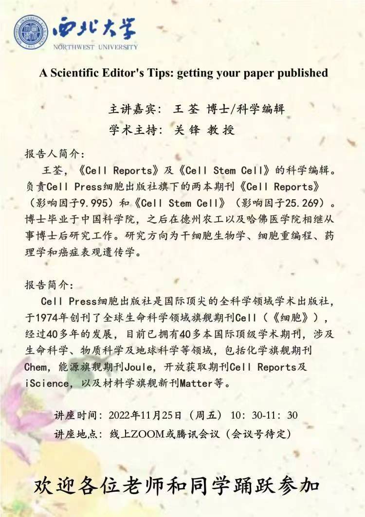 讲座时间:2022年11月25日(周五)10:30-11:30讲座地点:线上ZOOM或腾讯会议(会议号待定)