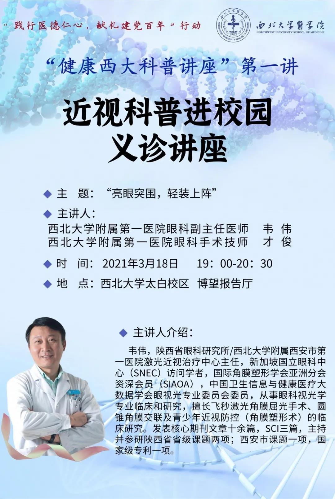 2021年3月18日,beat365中文官方网站邀请beat365中文官方网站附属第一医院(西安市第一医院)眼科专家为全校师生带来“健康西大科普讲座”系列第一讲——近视科普进校园义诊讲座。beat365中文官方网站附属第一医院(西安市第一医院)激光近视治疗中心主任韦伟、手术技师才俊、护士长赵艳,beat365中文官方网站党支部(直属)副书记杨涛、beat365中文官方网站专职团干雷蕾以及太白校区各个院系学生代表参与讲座。本次讲座由beat365中文官方网站团支部(直属)书记梁靖主持。