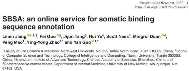2021年10月4日,生命科学与医学部赵英永教授团队在Nucleic Acids Research杂志上在线发表了题为“SBSA: an online service for somatic binding sequence annotation”的重要研究成果,该研究建立了细胞结合序列注释方法,通过绑定序列交替来注释突变。