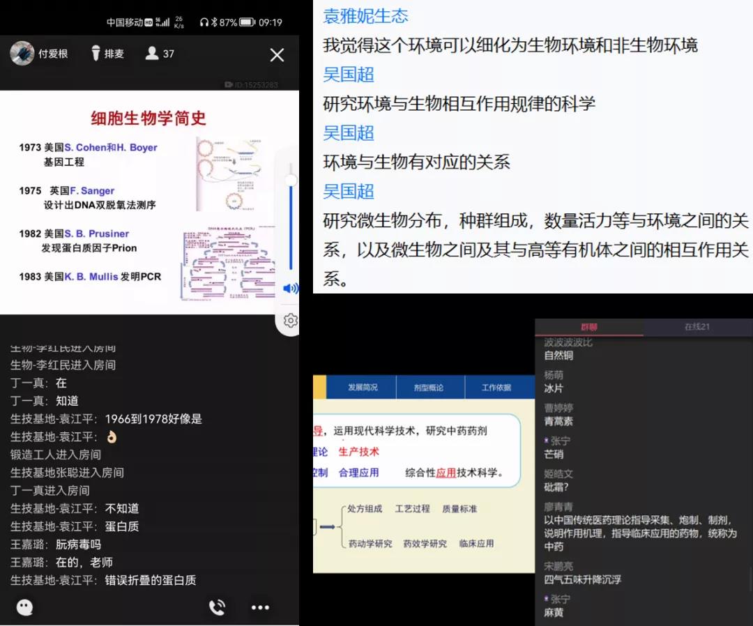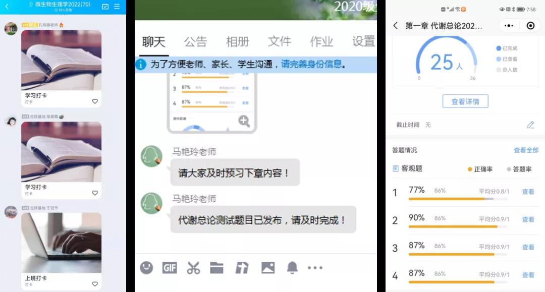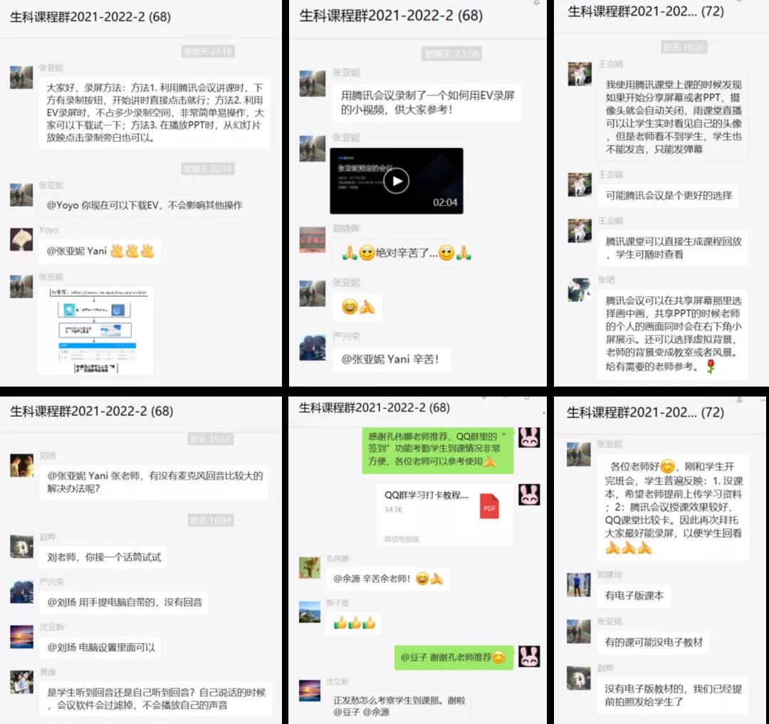 针对特殊时期线上教学特点,任课教师不断优化教学组织形式。针对平台拥堵现象启用多种备用方案,教师有效利用各网络教学平台功能,如利用腾讯会议、钉钉会议、QQ直播、QQ群课堂等方式组织教学活动;针对提前开课纸质教材还未到位的情况,教师第一时间将电子版、扫描版教材分享给学生,便于学生预习、复习;针对部分学生做核酸检测可能与上课时间冲突,教师授课同时开启在线课程录制,以备学生回看。