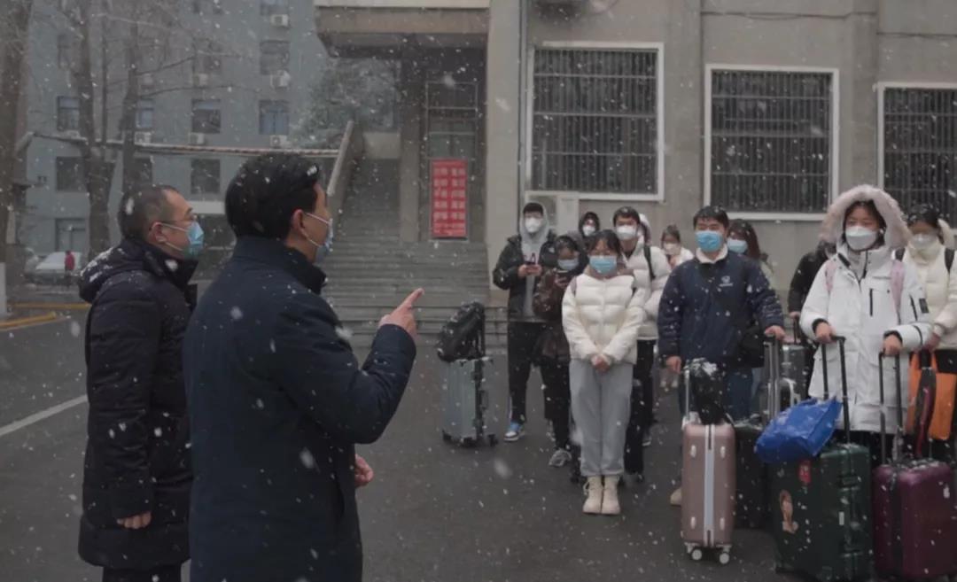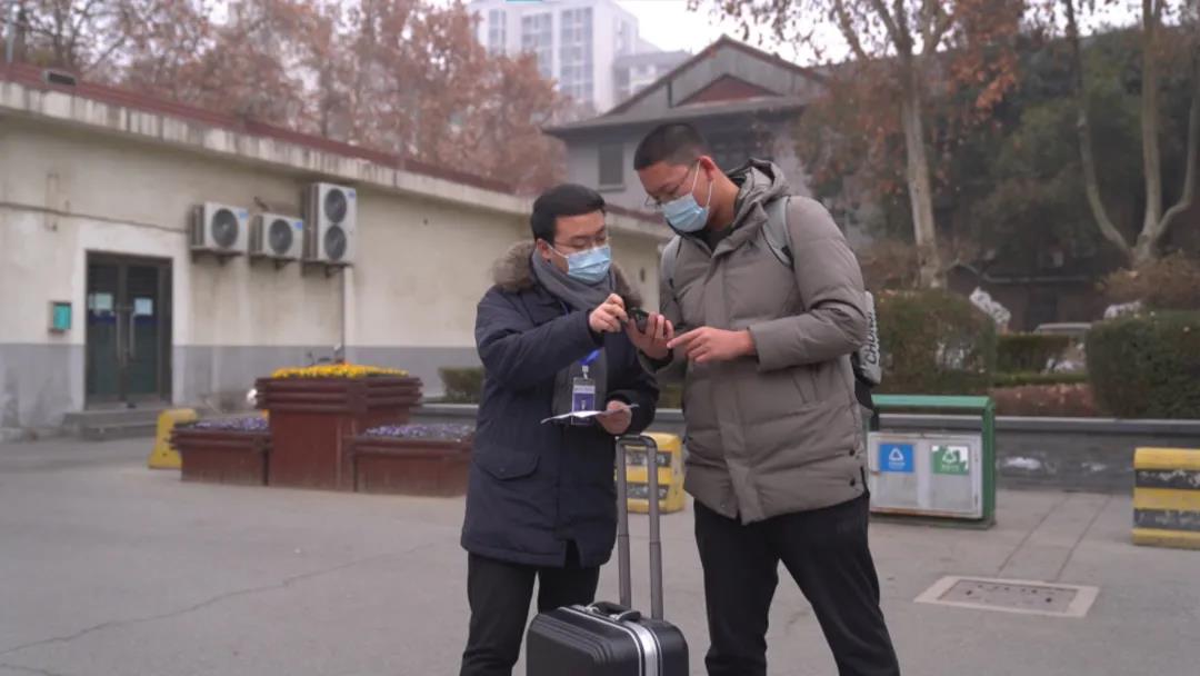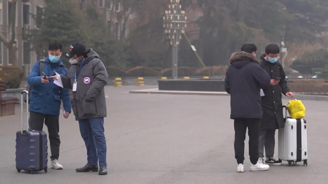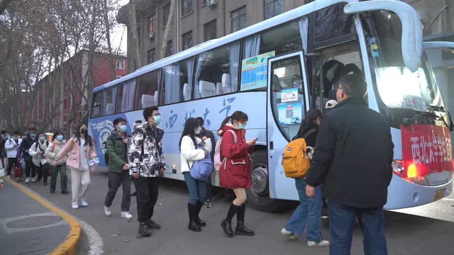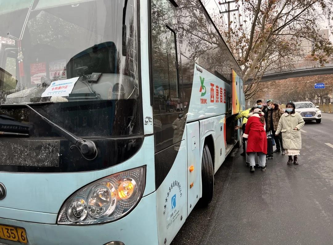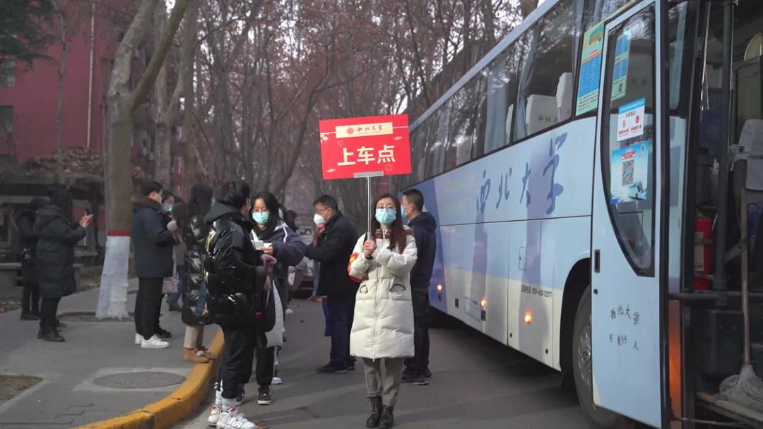 校党委书记王亚杰、副校长常江登上送站大巴,和返家学生一起前往西安北站。校党委副书记张清继续带领全体工作人员统计数据核查人数,有序组织学生排队上车,点对点运送学生直达两站一场。