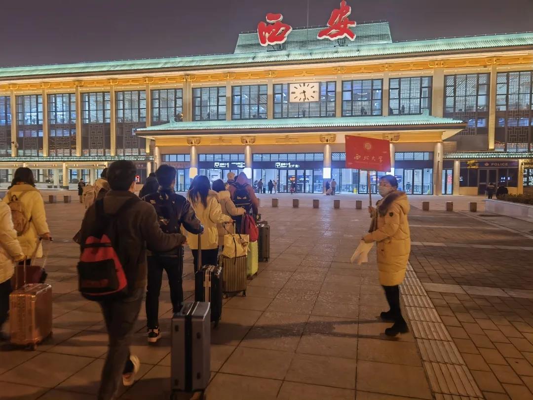 学生工作干部孟庆彬、范铭沁、米鑫、王君睿、雷蕾分别带领返家学生前往西安站、西安北站。