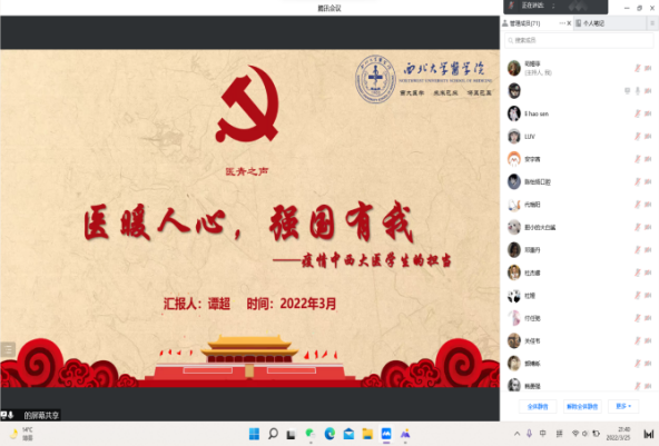 谭超向团员们展示了疫情中西大医学生的担当与作为,积极参与核酸采集工作、研究生考试疫情防控工作、一线医护人员子女义务家教等,鼓励团员们参加形式多样的志愿活动,将理论知识与社会实践有机结合起来,在实践中亲身体验和感悟“医人报国,精诚济世”的院训精神。