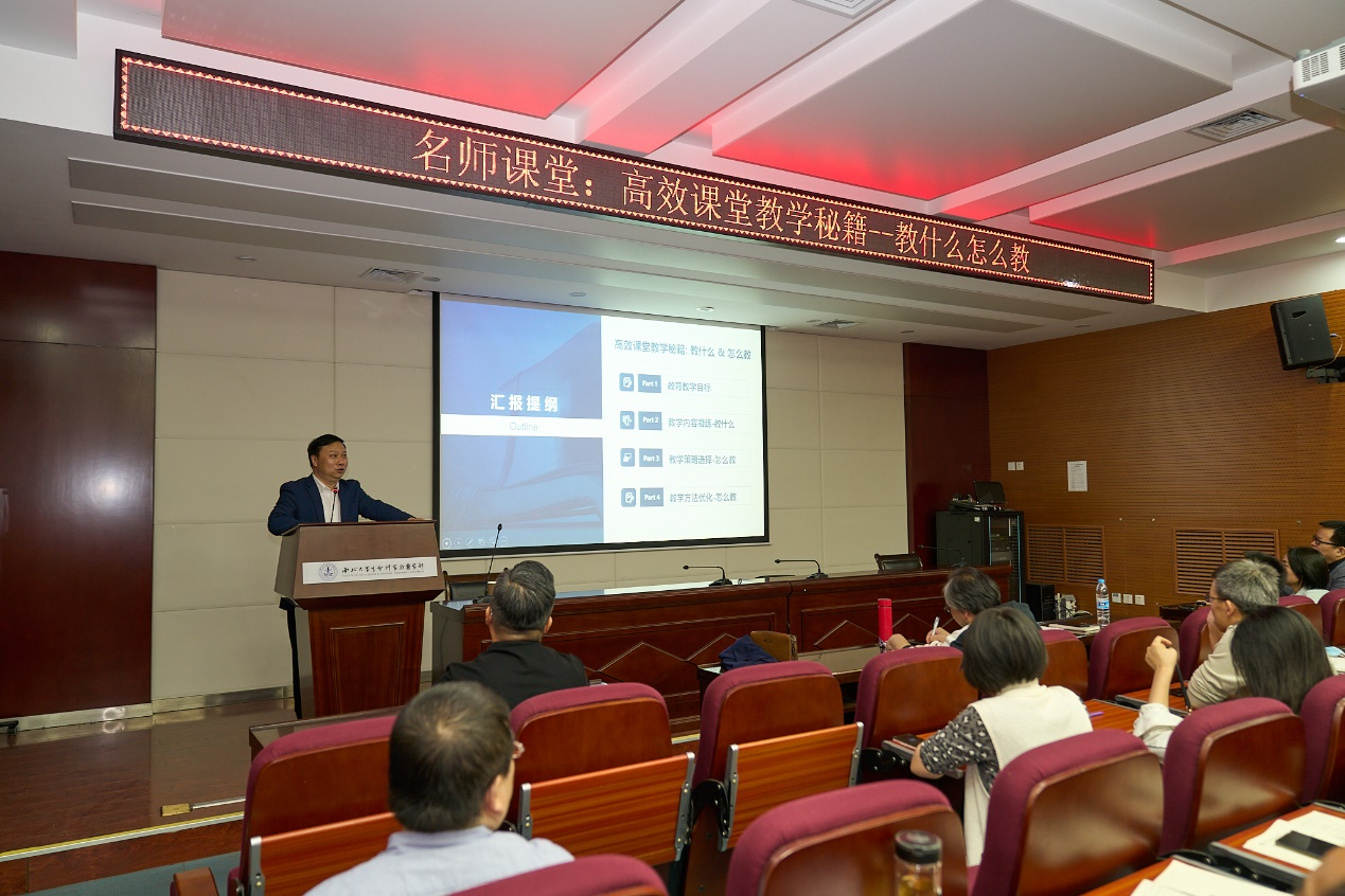 赖绍聪以“高效课堂教学秘籍:教什么怎么教”为题,围绕教育教学的目标、教学内容的凝练、教学策略的选择、教学方法的优化等四个方面与在座教师分享了他40余年的从教经验。他首先阐述了基于建构主义的当代教育理论,教育的本质是立人教育,教育的目的是促进学生的学习、提升学生的能力、促进学生的身心发展,教师的职责是教知识、教能力、教智慧、教品德。他指出,要紧紧围绕知识目标、能力目标、情感目标,凝练教学核心内容,依据知识逻辑和学生心里逻辑对课堂教学精心设计,建构“自主型课程学习”的A型课堂教学(Autonomous course study),实现学生从“要我学”向“我要学、我想学、我会学”的转变。他强调,高校教师要在教学过程中应扮演好“向导”角色,要精心对待每一堂课程,将自身对学科知识体系的感悟与思考融入教学,激发学生探究问题、解决问题能力为导向的教学方法,培养学生的独立人格、探索精神、学习能力和践行能力,树立正确的人生观和价值观。赖教授用生动幽默的语言给学部教师上了一堂生动的示范课。