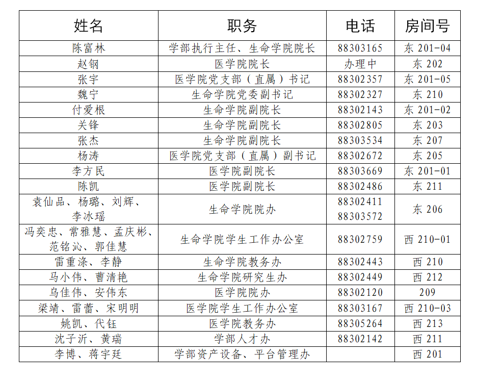 按照学校统一部署,根据事业发展需要,生命科学与医学部(生命科学学院、beat365中文官方网站)行政办公地点已集中搬迁至原文博学院2层,有关师生来访、办理学院事务请移步到学部新行政办公地点。