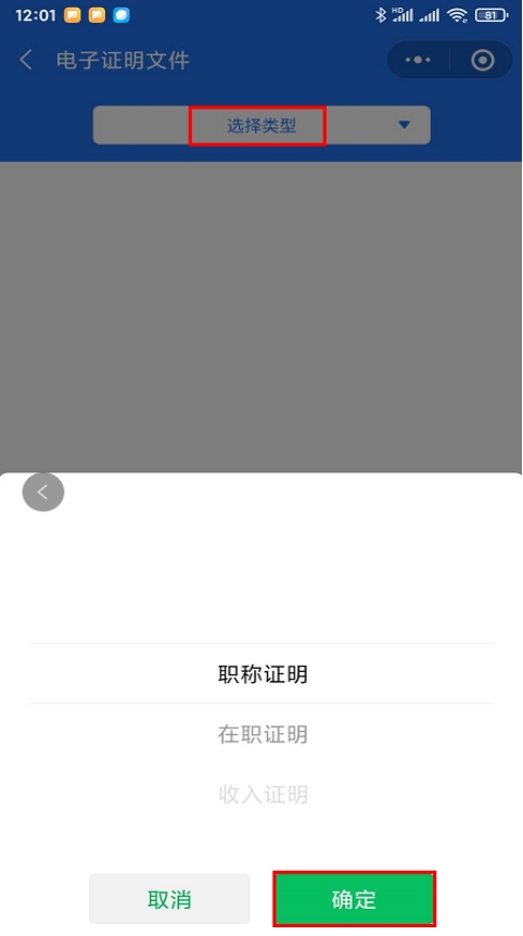 4.进入证明文件后选择自己需要的证明类型,点击确定按钮。