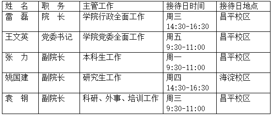 根据《BSport体育官网院领导接待日制度》的规定,结合学院实际,现开放本学期教学周BSport体育官网院领导接待日,具体安排如下: