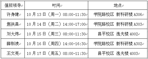 全院师生: 2014年10月13日至10月17日院领导接待日的具体安排通知如下: