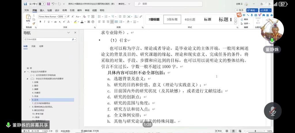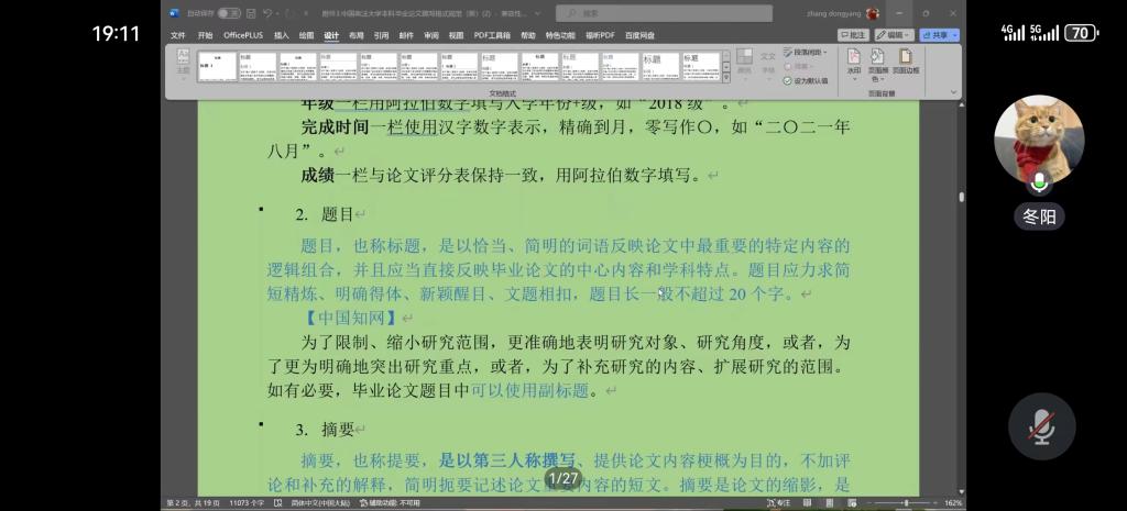 张冬阳老师对毕业论文中重要的规范要求进行了讲解。题目作为论文的总括,必须满足表述严谨、用词规范的基本要求,不能随意为之。在拟订题目时,可以参考中国知网上已发表的论文,学习其格式规范,尽量使用知网能够查询到的题目词。此外,论文的大纲目录起到通览全文、展现论文逻辑结构的重要作用,因此也需特别关注。