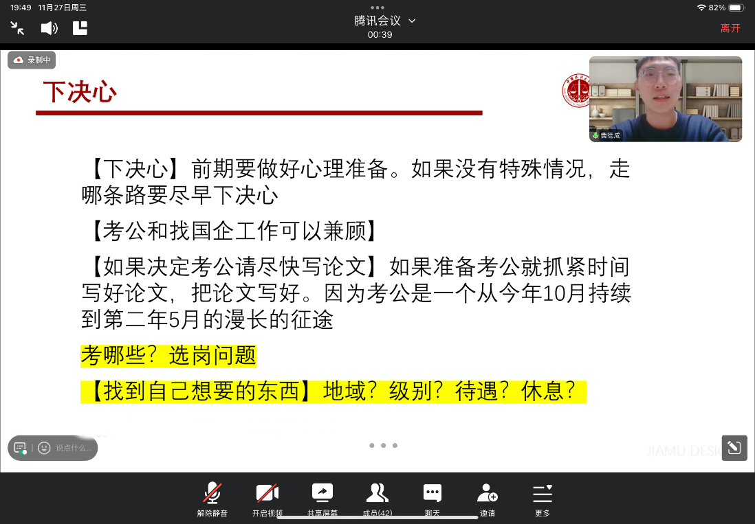 BSport体育官网2021级硕士黄德成,现就职于江苏省无锡市中级人民法院,与同学们分享了针对选调、国省考的备考经验和选岗技巧。首先,他介绍了面试的形式以及备考的几点注意事项。其次,他强调了好心态在备考中的重要性。然后,他就同学们事先提出的几个问题一一作出解答。最后,他鼓励同学们早下决心,提前规划,明确自己的个性化需求并坚定前进方向。