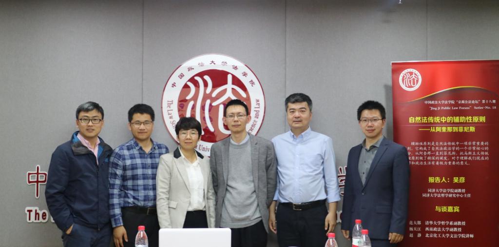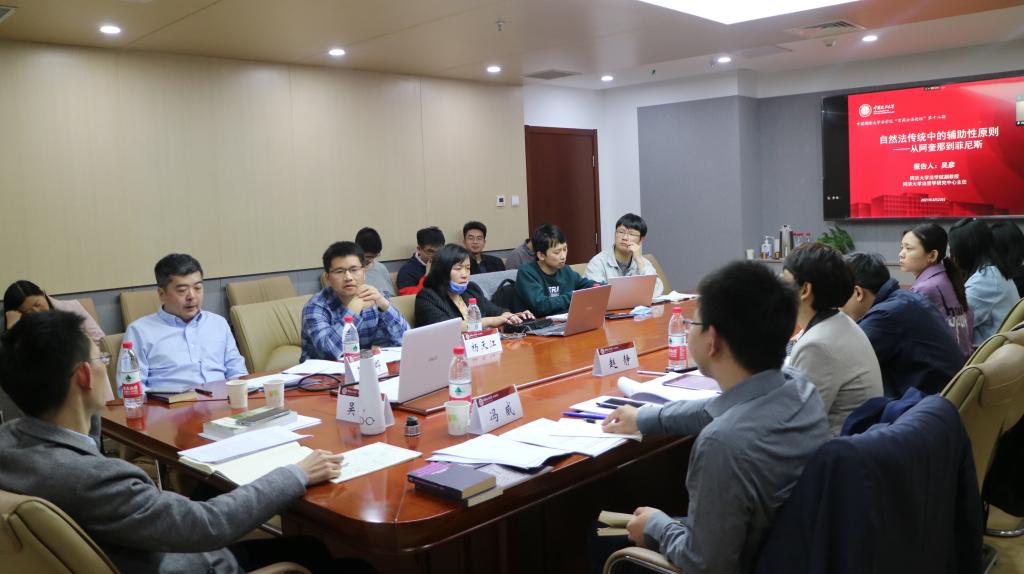 2021年4月23日晚上七点至九点半,“京蓟公法论坛”第十八期“自然法传统中的辅助性原则——从阿奎那到菲尼斯”讲座在学院路校区科研楼A913成功举办。本次讲座由同济大学BSport体育官网副教授、同济大学法哲学研究中心主任吴彦主讲,BSport体育官网讲师冯威博士主持,清华大学哲学系范大邯副教授、西南政法大学行政BSport体育官网暨监察BSport体育官网杨天江副教授、北京化工大学文BSport体育官网讲师赵静博士与谈。BSport体育官网郑玉双副教授参与讲座。讲座在线下和线上同时进行,线上有五十多名听众参与。