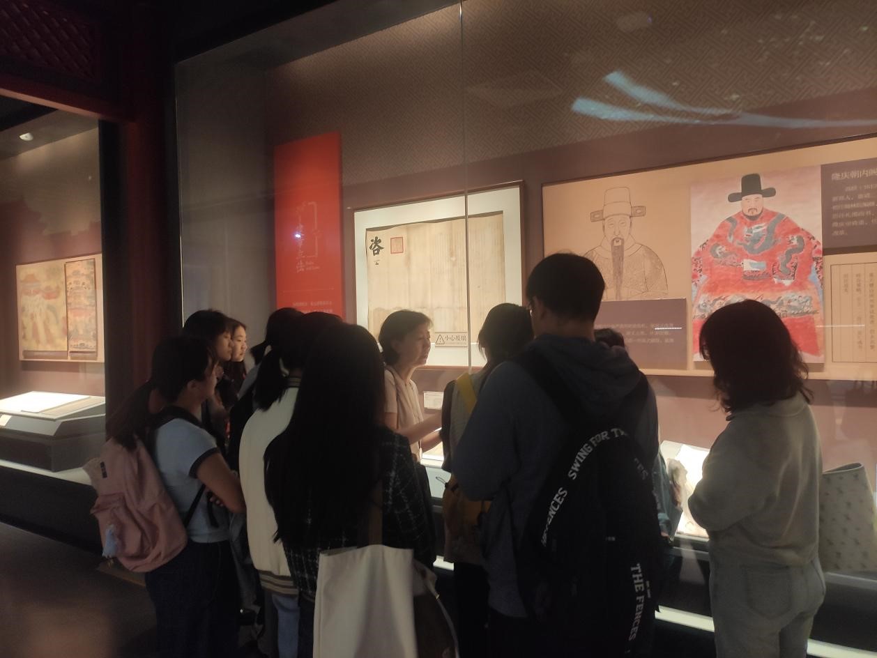 师生们依次参观了“兰台翰墨 家国春秋——明清历史档案展”“守护国家记忆 传承民族文脉——明清档案事业发展历程展”“盛载千秋——明清档案装具陈列展”3大展区。学生们在讲解员和三位老师的介绍下,深入探索了明清两代国家治理的宏伟蓝图与社会生活的丰富多彩。
