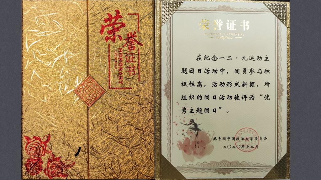 视频结束后,团支书和组织委员来奇同学组织开展了纪念“一二·九”运动有奖竞答活动,动员同学们积极参与,并为认真回答的同学们发放小礼品。最后,团支书就本次互动的展开情况做了简短的总结,并对本次活动的意义和目的做了进一步的强调,“一二·九”运动是中国共产党领导的一次大规模学生爱国运动,后续得到了全国人民的支持和回应,大大促进了中国人民的觉醒,不仅揭露了日本试图侵占中国、吞并华北的阴谋,也推动了抗日民族统一战线的建立,至此纪念“一二·九”学生运动主题团日活动圆满结束。团日活动结束后,经校团委评选,法双2001班团支部所组织的纪念“一二·九”运动主题团日活动成功入选为“优秀团日活动”,并被授予荣誉证书。