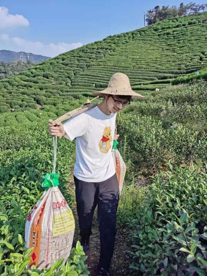 邵泽豪:我的家乡在杭州,家里有茶地,在每年春季时间充裕的情况下,我都会回家去参与农田劳作。这张照片展示的就是我挑着肥料,去茶叶地上施肥。因为我觉得中国龙井茶是我们中华民族传承下来的宝贵财富,不能在我们这一辈丢失,所以需要有一些人去做这些工作,去了解和掌握龙井茶是如何种植,如何培育,去弘扬龙井茶背后的文化。我觉得这对于锻炼个人品质与传承中华优秀传统文化都很有意义。
