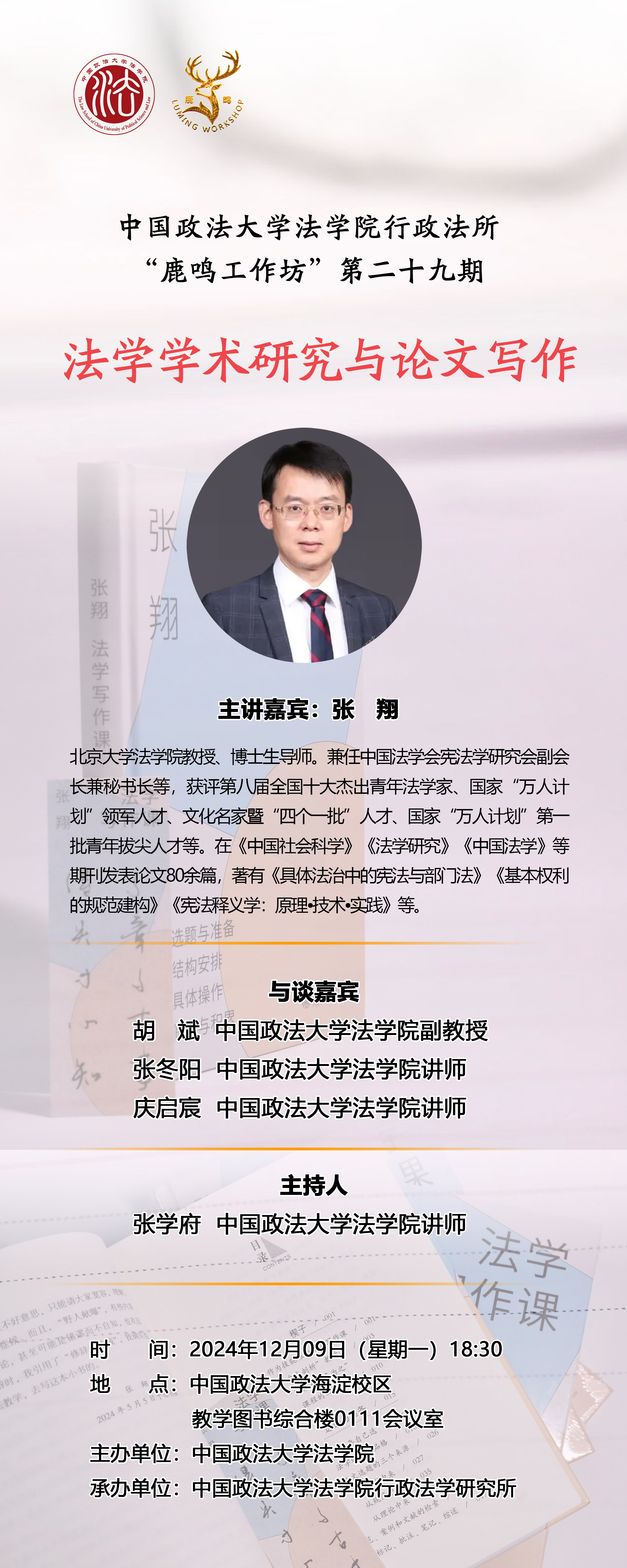 法学论文写作是学术科研的基础要求,是检验法律基本功和培养法律思维的重要环节。为帮助同学们提升论文写作水平,本期“鹿鸣工作坊”活动特别邀请了北京大学张翔教授,为大家讲解法学论文写作的选题及准备、结构安排、具体操作、修辞及积累等。