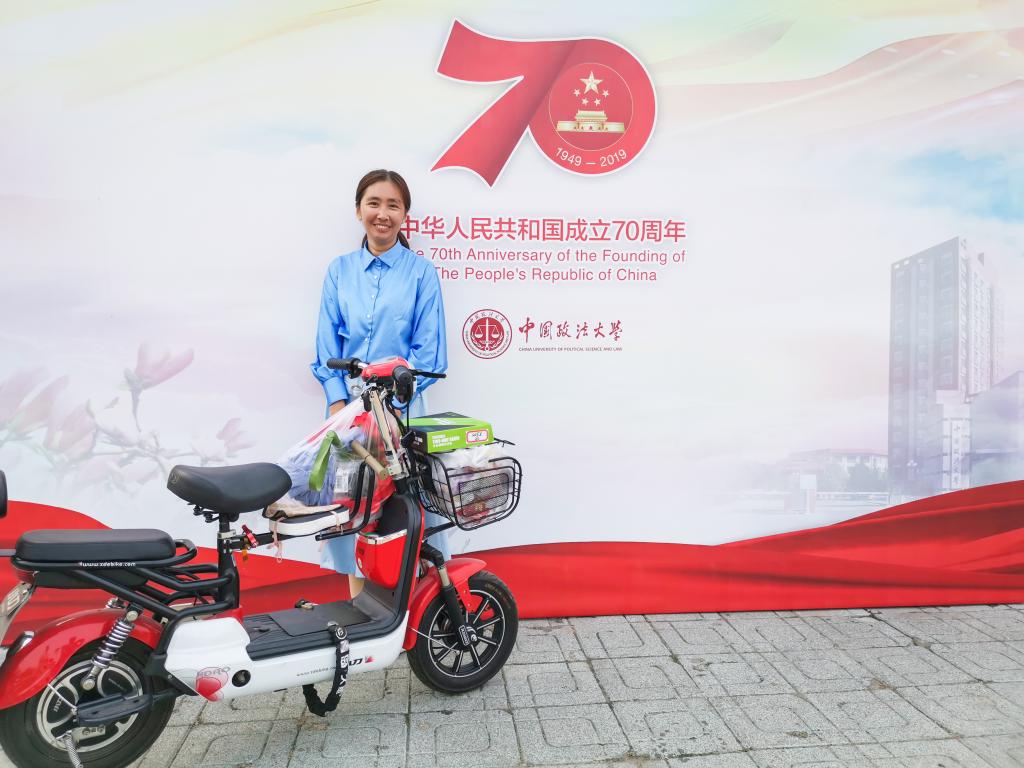 而在这背后,还有一个小故事。原来,杨老师初入法大之时,正值国庆六十周年,但由于筹备工作强度大,院内并未安排杨老师参与。十年的遗憾与对祖国无限的热爱,促使着她想要更积极地参与到筹备工作中,力求面面俱到,万无一失。而这一做,就是近四个月的日与夜——从六月的统计数量,到七月的物资分发,从八月的组装餐包,到九月的夜半守候,细心的同学可能早就发现,杨老师和她的电动车,早已成为训练场上的一道风景线。