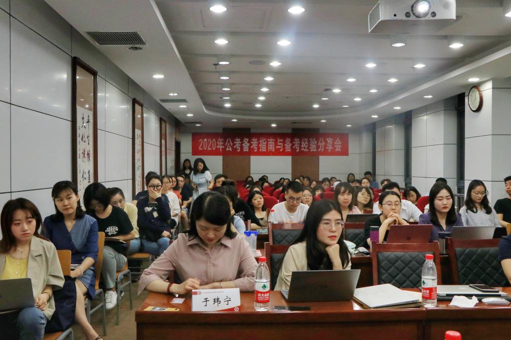 (法研通讯社 文/安香玉 图/蒲翠月)为了帮助同学们加强对公务员考试的了解,传承有益经验,促进就业率和就业质量双提升,5月23日晚,BSport体育官网研究生工作办公室在我校学院路校区科研楼B211举办了2020年公考备考指南与备考经验分享会。中公教育赵娇娇以及2019年公考学生代表谈文栋、郭林雄、于玮宁出席了本次活动。