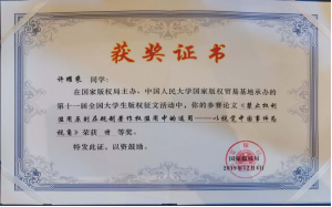 体育官网共三名同学取得佳绩,分别是许耀乘同学一文《禁止权利滥用原则在规制著作权滥用中的适用——以视觉中国事件为视角》获特等奖,由冯晓青老师指导;刘衡同学《任意诉讼担当视域下著作权商业维权现象分析》获研究生组二等奖,由佘力焓老师指导;龙书培同学《著作权纠纷中电子存证的审查与认定研究》获研究生组二等奖。其中我校共5人获奖,BSport体育官网获奖同学3名,占比60%,其中特等奖获得者许耀乘同学以《禁止权利滥用原则在规制著作权滥用中的适用——以视觉中国事件为视角》为题作为本次研讨会的主旨演讲人之一,在会议现场发表了自己的看法。